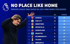 本赛季英超主场战绩榜:阿森纳19分居首,热刺5分倒数第二